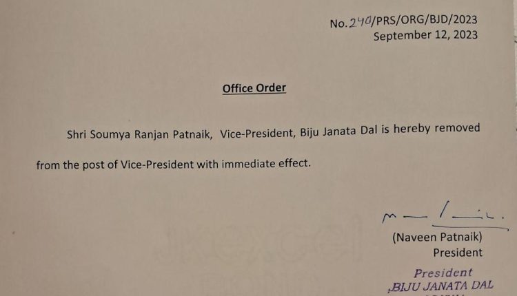 ସୌମ୍ୟରଞ୍ଜନ ପଟ୍ଟନାୟକଙ୍କୁ ଉପସଭାପତି ପଦରୁ ବହିଷ୍କୃତ କରିଛନ୍ତି ମୁଖ୍ୟମନ୍ତ୍ରୀ ନବୀନ ପଟ୍ଟନାୟକ।