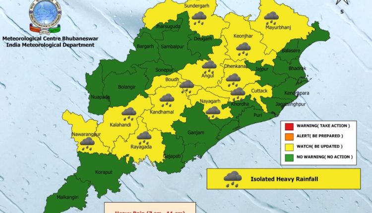 ଆଗାମୀ ୨୪ ଘଣ୍ଟା ମଧ୍ୟରେ ନବରଙ୍ଗପୁର, କଳାହାଣ୍ଡି, କନ୍ଧମାଳ, ରାୟଗଡ଼ା, ନୟାଗଡ଼, ବୌଦ୍ଧ, କଟକ, ଅନୁଗୁଳ, ଢ଼େଙ୍କାନାଳ, କେନ୍ଦୁଝର, ମୟୂରଭଞ୍ଜ, ଓ ସୁନ୍ଦରଗଡ଼ ଜିଲ୍ଲାର ଗୋଟିଏ କିମ୍ବା ଦୁଇଟି ସ୍ଥାନରେ ପ୍ରବଳ ବର୍ଷା ସହ ବଜ୍ରପାତ ହେବାର ସମ୍ଭାବନା ରହିଛି। ସେଥିପାଇଁ ଏହି ସବୁ ଜିଲ୍ଲାକୁ ୟେଲୋଓ୍ଵାର୍ଣ୍ଣିଂ ଜାରି କରିଛି ପାଣିପାଗ ବିଭାଗ।
