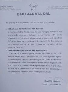 ରେମୁଣା ବିଧାୟକ ବିଜେଡିରୁ ବହିଷ୍କୃତ