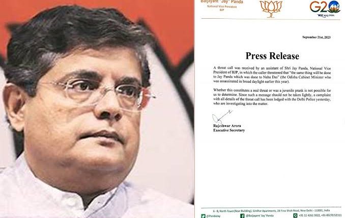 ବିଜେପିର ରାଷ୍ଟ୍ରୀୟ ଉପାଧ୍ୟକ୍ଷ ବୈଜୟନ୍ତ ପଣ୍ଡାଙ୍କୁ ହତ୍ୟା ଧମକ ମିଳିଛି।
