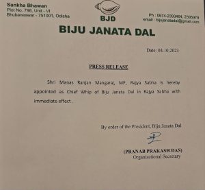 ମାନସ ମଙ୍ଗରାଜଙ୍କୁ ରାଜ୍ୟସଭାରେ ବିଜେଡିର ମୁଖ୍ୟ ସଚେତକ ଭାବେ ନିଯୁକ୍ତ କରାଯାଇଛି।