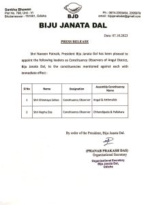 ଭୁବନେଶ୍ୱର, ୦୮/୧୦/୨୦୨୩: ବିଜୁ ଜନତା ଦଳର ସଭାପତି ଶ୍ରୀ ନବୀନ ପଟ୍ଟନାୟକ ଆଜି ଅନୁଗୁଳ ଜିଲ୍ଲାର ପ୍ରତି ନିର୍ବାଚନମଣ୍ଡଳୀର ନିର୍ବାଚନ ପର୍ଯ୍ୟବେକ୍ଷକ ଭାବେ ବିଭିନ୍ନ ନେତାଙ୍କୁ ଦାୟିତ୍ବ ପ୍ରଦାନ କରିଛନ୍ତି।