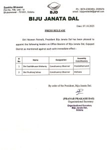ଶ୍ରୀ ନବୀନ ପଟ୍ଟନାୟକ ନିମ୍ନଲିଖିତ ନେତାମାନଙ୍କୁ ଗଜପତି ଜିଲ୍ଲାର କର୍ମକର୍ତ୍ତା ଭାବରେ ନିଯୁକ୍ତ କରିଛନ୍ତି।