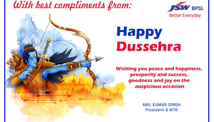 ଭୁବନେଶ୍ବର, ୨୩.୧୦.୨୦୨୩: ଜେଏସଡବ୍ଲ୍ୟୁ ବିପିସିଏଲ ପବିତ୍ର ଦଶହରା ଅବସରରେ ସଭିଙ୍କୁ ଶୁଭେଚ୍ଛା ଜଣାଇଛି। ଜେଏସଡବ୍ଲ୍ୟୁ ଶାନ୍ତି ଓ ସୁଖ, ସମୃଦ୍ଧି ଏବଂ ସଫଳତା, ସୌଭାଗ୍ୟ ଓ ଆନନ୍ଦ କାମନା କରି ଶୁଭେଚ୍ଛା ଜଣାଇଛି।