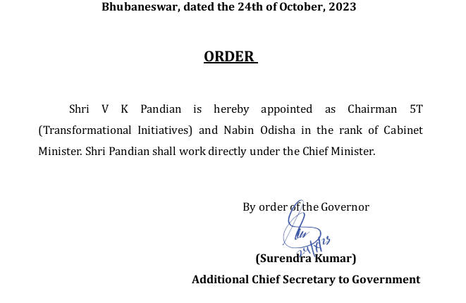 5T ସଚିବରୁ 5T ଅଧ୍ୟକ୍ଷ ଭାବେ ପାଣ୍ଡିଆନଙ୍କୁ ନିଯୁକ୍ତି ଦେଲେ ରାଜ୍ୟ ସରକାର।