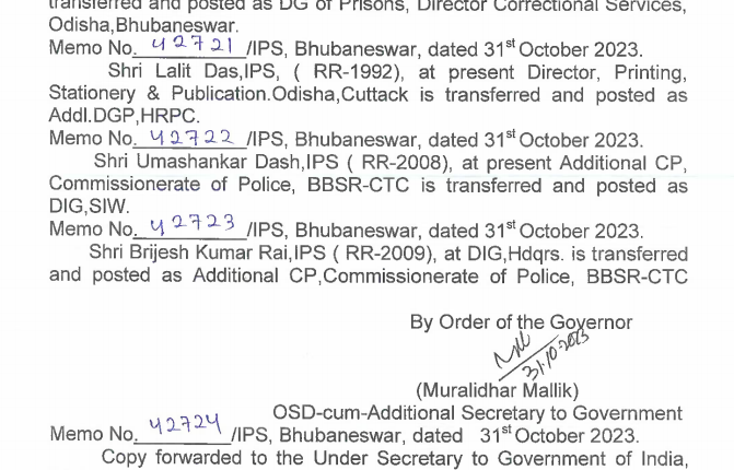 କଟକ ପ୍ରିଣ୍ଟିଂ, ଷ୍ଟେସନାରୀ ଓ ପବ୍ଲିକେସନ୍ ନିର୍ଦ୍ଦେଶକ ଭାବେ କାର୍ଯ୍ୟରତ ଥିବା ଶ୍ରୀ ଲଳିତ ଦାସଙ୍କୁ ଆଡିସନାଲ ଡିଜିପି, ଏଚ୍ ଆର୍ ପିସି ଭାବେ ନିଯୁକ୍ତି ଦିଆଯାଇଛି।