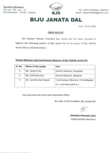 ଭୁବନେଶ୍ବର, ୦୯/୦୨/୨୦୨୪: ବିଜୁ ଜନତା ଦଳର ସଭାପତି ନବୀନ ପଟ୍ଟନାୟକ ଆଜି ବିଜେଡିର କିଛି ନାରୀ ନେତ୍ରୀମାନଙ୍କୁ ବିଜୁ ମହିଳା ଜନତା ଦଳର ବିଭିନ୍ନ ପଦବୀରେ ନିଯୁକ୍ତ କରିଛନ୍ତି। ନିମ୍ନରେ ପ୍ରଦତ୍ତ: