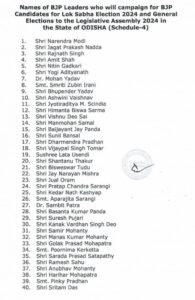 ଓଡ଼ିଶାରେ ଲୋକସଭା ଓ ବିଧାନସଭା ନିର୍ବାଚନ ପାଇଁ ବିଜେପିର ପ୍ରାର୍ଥୀମାନଙ୍କ ପାଇଁ ଷ୍ଟାର ପ୍ରଚାରକ ତାଲିକା ଘୋଷଣା କରାଯାଇଛି।