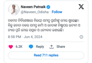 ଏକ୍ସ ଜରିଆରେ ନବୀନ ସମସ୍ତ ବିଜୁ ଜନତା ଦଳର କର୍ମକର୍ତ୍ତା ଓ ନେତାଙ୍କୁ ସେମାନଙ୍କ ଉତ୍ସର୍ଗୀକୃତ ପ୍ରୟାସ ଓ ବଳିଦାନ ପାଇଁ ଧନ୍ୟବାଦ ଓ କୃତଜ୍ଞତା ଜଣାଇଛନ୍ତି।