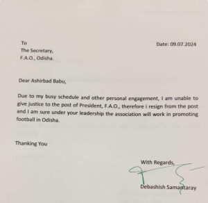 ନିଜର ବ୍ୟକ୍ତିଗତ କାରଣ ଦର୍ଶାଇ ସଭାପତି ପଦରୁ ଇସ୍ତଫା ଦେଇଛନ୍ତି। ବ୍ୟସ୍ତତା ଏବଂ ବ୍ୟକ୍ତିଗତ କାରଣରୁ ମୁଁ ଏଫ୍ଏଓର ସଭାପତି ପଦକୁ ନ୍ୟାୟ ଦେଇପାରୁନାହିଁ। ତେଣୁ ମୁଁ ପଦରୁ ଇସ୍ତଫା ଦେଉଛି ଏବଂ ଶ୍ରୀ ବେହେରାଙ୍କ ନେତୃତ୍ୱରେ ସଂଘ ଓଡ଼ିଶାରେ ଫୁଟବଲର ପ୍ରଚାର ପ୍ରସାର ଦିଗରେ କାର୍ଯ୍ୟ କରିବ ବୋଲି ଶ୍ରୀ ସାମନ୍ତରାୟ ଚିଠିରେ ଲେଖିଛନ୍ତି।