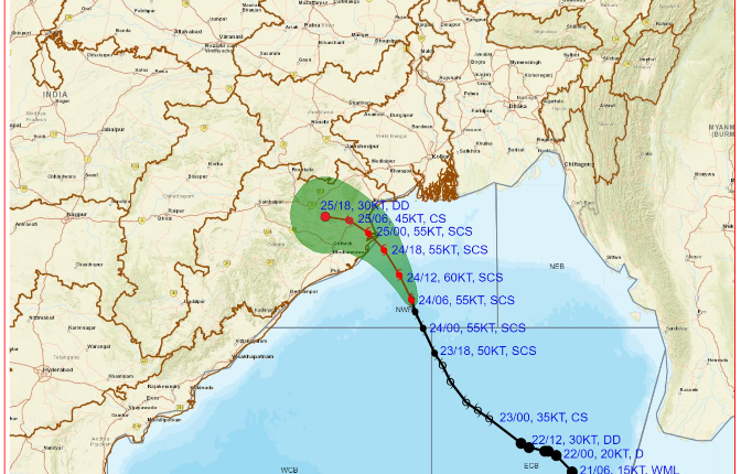ଭୁବନେଶ୍ବର, ୨୪/୧୦: ଉତ୍ତର-ପଶ୍ଚିମ ବଙ୍ଗୋପସାଗରରେ ସୃଷ୍ଟି ହୋଇଥିବା ଘୂର୍ଣ୍ଣିବଳୟ ‘ଦାନା’ ଘଣ୍ଟା ପ୍ରତି ୧୦ କିଲୋମିଟର ବେଗରେ ଉତ୍ତର-ଉତ୍ତର ପଶ୍ଚିମ ଦିଗକୁ ଗତି କରୁଛି। ଏହା ପାରାଦୀପଠାରୁ ପ୍ରାୟ ୧୫୦ କିଲୋମିଟର ଦକ୍ଷିଣ-ପୂର୍ବ, ଧାମରାଠାରୁ ୧୮୦ କିଲୋମିଟର ଦକ୍ଷିଣ-ଦକ୍ଷିଣ-ପୂର୍ବ ଏବଂ ସାଗର ଦ୍ୱୀପଠାରୁ ୨୫୦ କିଲୋମିଟର ଦକ୍ଷିଣରେ ରହିଛି। ସାମୁଦ୍ରିକ ଝଡ଼ ‘ଦାନା’ ଉପକୂଳ ଆଡ଼କୁ ମୁହାଁଉଥିବା ବେଳେ ଆଜି ରାତି ୩ଟା ସୁଦ୍ଧା ଲ୍ୟାଣ୍ଡଫଲ କରିପାରେ ବୋଲି ଆଇଏମଡି ଆକଳନ କରିଛି। ଲ୍ୟାଣ୍ଡଫଲ ସମୟରେ ଘଣ୍ଟା ପ୍ରତି ୧୦୦ରୁ ୧୧୦ କିଲୋମିଟର ବେଗରେ ପବନ ବହିବାର ସମ୍ଭାବନା ରହିଛି।