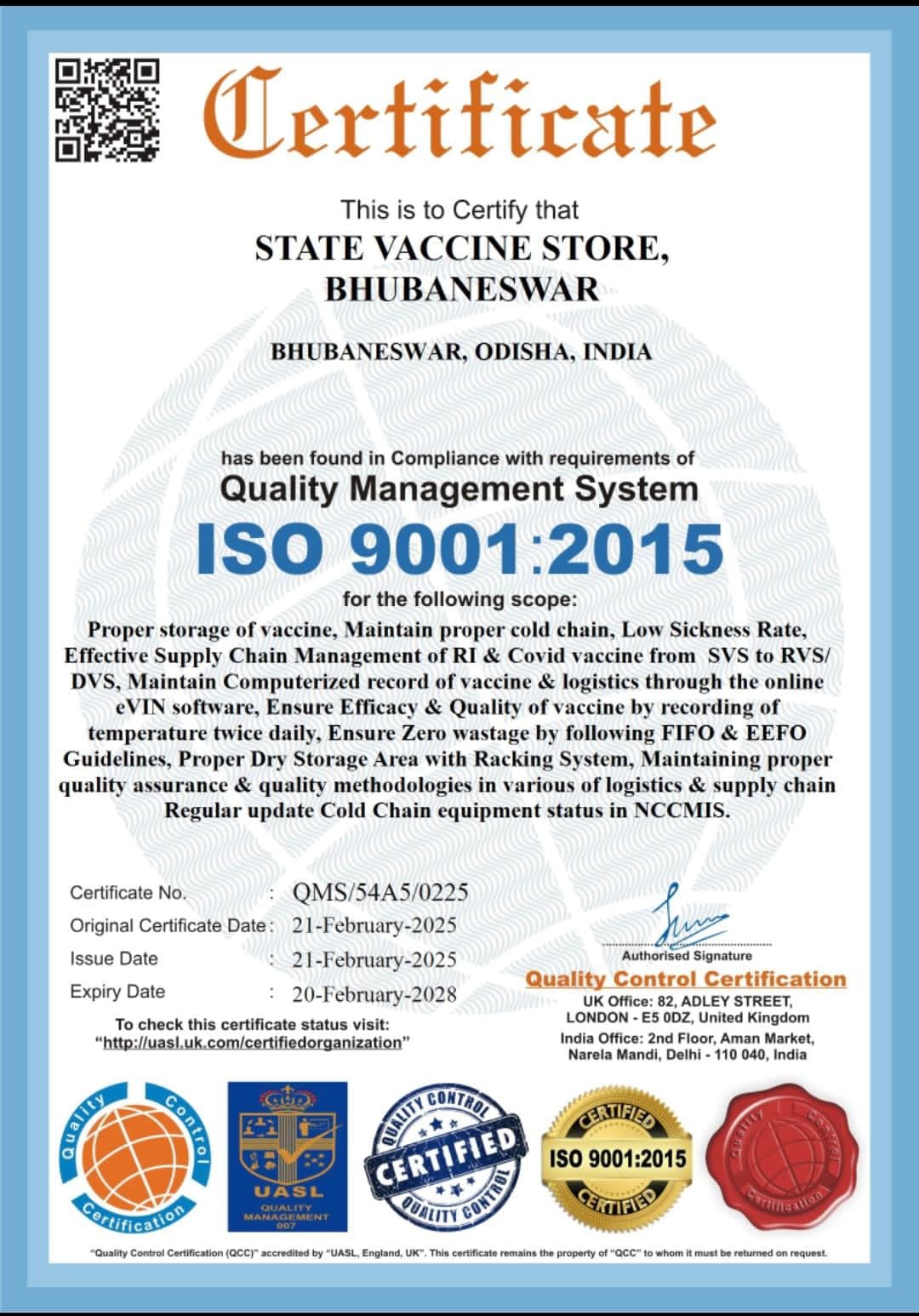 ସୂଚନାଯୋଗ୍ୟ ଯେ, ପୂର୍ବରୁ ରାଜ୍ୟର ୭ଟି ଆଞ୍ଚଳିକ ଏବଂ ୨୨ଟି ଜିଲ୍ଲା ଟୀକା ଭଣ୍ଡାର ISO 9001:2015 ପ୍ରମାଣପତ୍ର ପାଇସାରିଛନ୍ତି ।