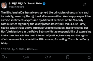 ତେବେ ଆଜି ଦଳର ମୁଖପାତ୍ର ସସ୍ମିତ ପାତ୍ର ଟୁଇଟ୍ କରି କହିଛନ୍ତି ଯେ ଯଦି ବିଲ୍ ଭୋଟିଂ ପାଇଁ ଆସେ ତେବେ ଦଳ ନିଜ ସଦସ୍ୟମାନଙ୍କୁ ନ୍ୟାୟ, ସଦ୍ଭାବ ଓ ସମସ୍ତ ସମ୍ପ୍ରଦାୟର ଅଧିକାର ପାଇଁ ନିଜର ବିବେକ ପ୍ରୟୋଗ କରିବାକୁ ଦାୟିତ୍ବ ଦେଇଛି। ବିଜେଡି ପକ୍ଷରୁ ଏନେଇ କୌଣସି ହ୍ବିପ୍ ଜାରି ହୋଇ ନାହିଁ ବୋଲି ସସ୍ମିତ ପାତ୍ର କହିଛନ୍ତି।