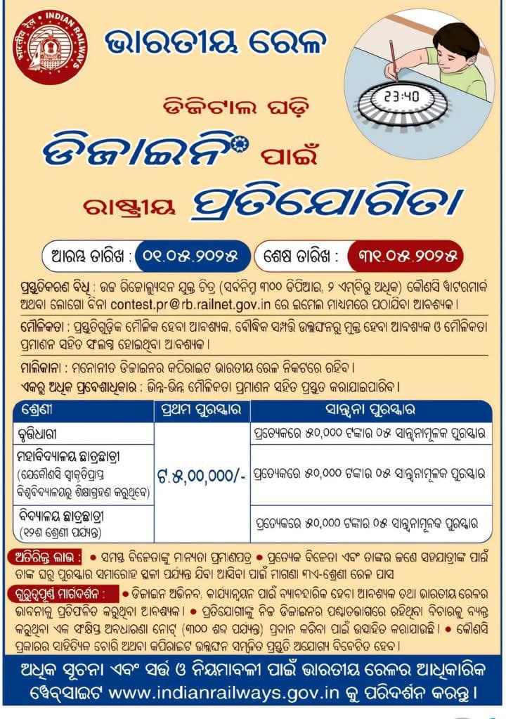 ଭୁବନେଶ୍ୱର, ୦୨/୦୫: ଭାରତୀୟ ରେଳବାଇ ନୂତନ ଡିଜିଟାଲ୍ ଘଣ୍ଟା ଡିଜାଇନ୍ କରିବା ପାଇଁ ଏକ ଦେଶବ୍ୟାପୀ ପ୍ରତିଯୋଗିତା ଘୋଷଣା କରିଛି ଯାହା ଦେଶର ସମସ୍ତ ରେଳ ଷ୍ଟେସନରେ ସ୍ଥାପନ କରାଯିବ | ରେଳବାଇ ସୃଜନଶୀଳ ଲୋକଙ୍କଠାରୁ ଘଣ୍ଟା ଡିଜାଇନ୍ ପ୍ରତିଯୋଗିତା ପାଇଁ ଆମନ୍ତ୍ରଣ କରିଛି | ଏହି ପ୍ରତିଯୋଗିତା ପ୍ଲାଟଫର୍ମ ଏବଂ ଷ୍ଟେସନରେ ବ୍ୟବହୃତ ଡିଜିଟାଲ୍ ଘଣ୍ଟାକୁ ମାନକୀକରଣ କରିବା ପାଇଁ ଲକ୍ଷ୍ୟ ରଖିଛି ଏବଂ ଏହା ତିନୋଟି ବର୍ଗର ଅଂଶଗ୍ରହଣକାରୀଙ୍କ ପାଇଁ ମୁକ୍ତ ରହିବ ଯେଉଁମାନେ କି ବୃତ୍ତିଗତ, କଲେଜ/ବିଶ୍ୱବିଦ୍ୟାଳୟ ଛାତ୍ର ଏବଂ ସ୍କୁଲ ଛାତ୍ର |