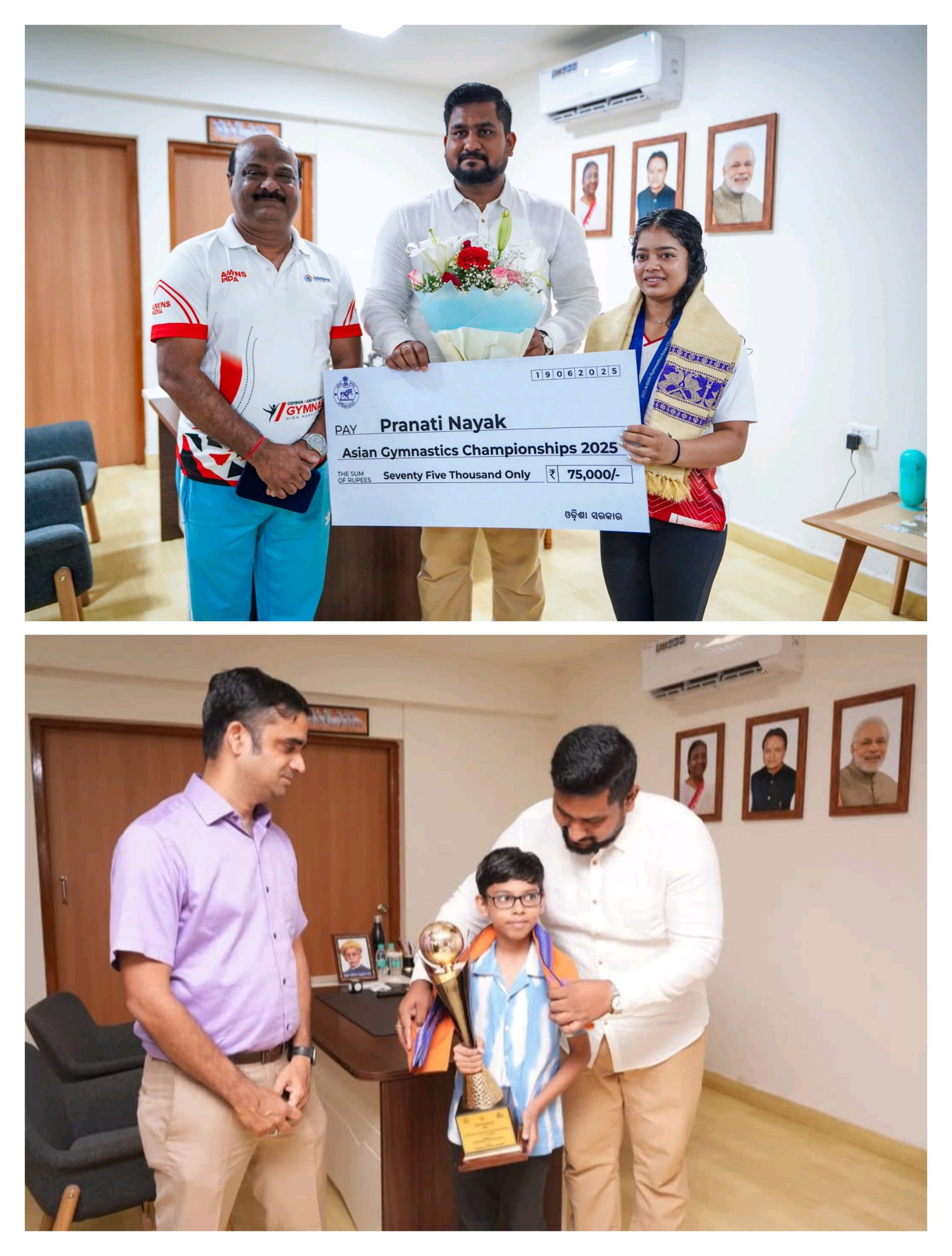 ଭୁବନେଶ୍ୱର, ୨୪/୦୬: ଏସିଆନ୍ ଆର୍ଟିଷ୍ଟିକ୍ ଜିମ୍ନାଷ୍ଟିକ ଚାମ୍ପିଅନସିପ୍-୨୦୨୫ରେ କାଂସ୍ୟ ପଦକ ଜିତିଥିବା କ୍ରୀଡ଼ାବିତ୍ ପ୍ରଣତୀ ନାୟକ ଏବଂ ୩୮ତମ ନ୍ୟାସନାଲ୍ ଅଣ୍ଡର-୯ ଚେସ୍ ଚାମ୍ପିଅନସିପ୍ରେ (୩୮ତମ ଜାତୀୟ ୯ବର୍ଷରୁ କମ୍ ଚେସ୍ ଚାମ୍ପିଅନସିପ୍) ସଫଳତା ଅର୍ଜନ କରିଥିବା ସାତ୍ତ୍ବିକ ସ୍ବାଇଁଙ୍କୁ ଆଜି ସମ୍ବର୍ଦ୍ଧିତ କରାଯାଇଛି।