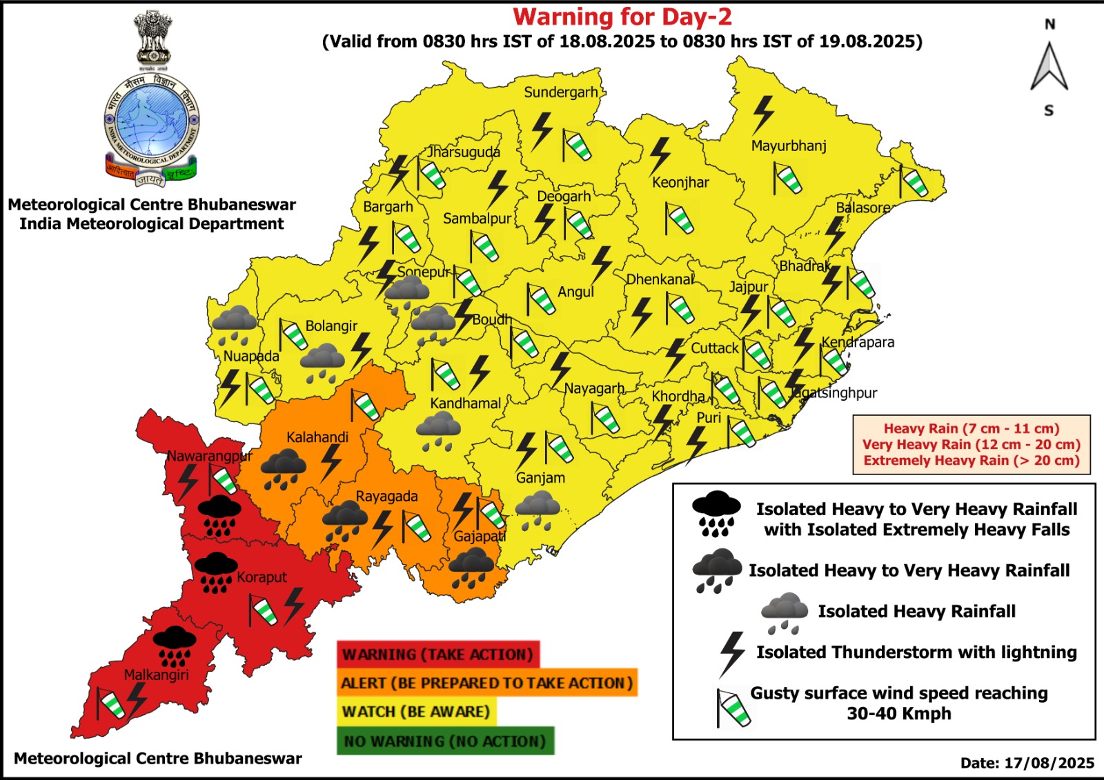 ଏ ନେଇ ୧୫ଟି ଜିଲ୍ଲା ପାଇଁ ୟେଲୋ ୱାର୍ଣ୍ଣିଂ ଜାରି କରାଯାଇଛି। ସେଗୁଡିକ ହେଲା ନବରଙ୍ଗପୁର, ଭଦ୍ରକ, ବାଲେଶ୍ବର, ଗଞ୍ଜାମ, ରାୟଗଡ଼ା, କନ୍ଧମାଳ ଓ କଳାହାଣ୍ଡି, କଟକ-ଭୁବନେଶ୍ବର, ଖୋର୍ଦ୍ଧା, ପୁରୀ, ଗଜପତି, ଜଗତସିଂହପୁର, କେନ୍ଦ୍ରାପଡ଼ା, ଯାଜପୁର ଓ ମାଲକାନଗିରି।
