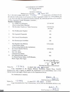 ପୁରୀ, ୨୬/୮: ଗଠନ ହେଲା ଶ୍ରୀମନ୍ଦିର ପରିଚାଳନା କମିଟି। କମିଟିରେ ସ୍ଥାନ ପାଇଛନ୍ତି ୧୦ ସଦସ୍ୟ। ଏନେଇ ଆଇନ ବିଭାଗ ପକ୍ଷରୁ ବିଜ୍ଞପ୍ତି ପ୍ରକାଶ ପାଇଛି।