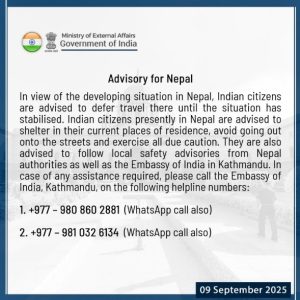ନୂଆଦିଲ୍ଲୀ, ୯/୯: ନେପାଳରେ ସରକାର ବିରୋଧୀ ହିଂସାତ୍ମକ ପ୍ରତିବାଦ ଜାରି ରହିଥିବାରୁ, ଭାରତ ନିଜର ନାଗରିକମାନଙ୍କୁ ପାଇଁ ଆଡଭାଇଜରି ଜାରି କରିଛି। ନେପାଳରେ ଥିବା ଭାରତୀୟଙ୍କ ପାଇଁ ବୈଦେଶିକ ମନ୍ତ୍ରାଳୟ ଆଡଭାଇଜରୀ ଜାରି କରିଛି।