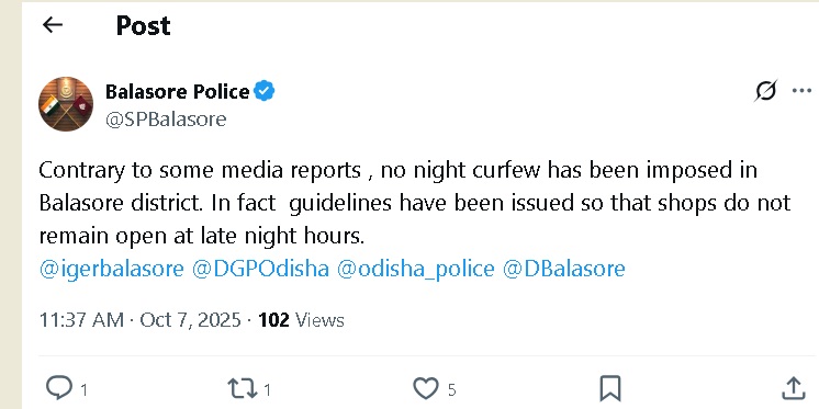 ବାଲେଶ୍ବରରେ କର୍ଫ୍ୟୁ ମିଛ ଖବର: ଏସ୍ପି ‘ଏକ୍ସ’ରେ ସୂଚନା ଦେଲେ ବାଲେଶ୍ୱର ଏସ୍ପି By Darshana On Oct 7, 2025 89 0 ବାଲେଶ୍ଵର, ୭/୧୦: ବାଲେଶ୍ୱରରେ କର୍ଫ୍ୟୁ ନେଇ ପ୍ରଚାରିତ ହେଉଥିବା ଖବର ମିଛ। ‘ଏକ୍ସ’ ଜରିଆରେ ସୂଚନା ଦେଲେ ବାଲେଶ୍ୱର ଏସ୍ପି। କିଛି ଗଣମାଧ୍ୟମରେ ରାତ୍ରକାଳୀନ କର୍ଫ୍ୟୁ ଲାଗିଥିବା ନେଇ ଖବର ପ୍ରକାଶିତ ହୋଇଛି। କେବଳ ରାତିରେ ଦୋକାନ ଖୋଲା ନ ରଖିବାକୁ ନିର୍ଦ୍ଦେଶ ରହିଛି। 0 89 Share
