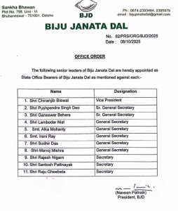 ଭୁବନେଶ୍ଵର, ୮/୧୦: ୧୧ ଜଣ ବରିଷ୍ଠ ନେତାଙ୍କୁ ସାଂଗଠନିକ ଦାୟିତ୍ବ ଦେଲା ବିଜେଡି। ଚିରଞ୍ଜୀବ ବିଶ୍ବାଳ ଉପସଭାପତି, ପୁଷ୍ପେନ୍ଦ୍ର ସିଂଦେଓ ବରିଷ୍ଠ ସା. ସମ୍ପାଦକ, ଗଣେଶ୍ବର ବେହେରା ବରିଷ୍ଠ ସା. ସମ୍ପାଦକ, ସୁଧିର ଦାସ ସା. ସମ୍ପାଦକ, ଲମ୍ବୋଦର ନିଆଲ, ଅଳକା ମହାନ୍ତି, ଈରାନୀ ରାୟ, ମନୋଜ ମିଶ୍ର ସା. ସମ୍ପାଦକ, ଏବଂ ରାଜେଶ ନିଗମ, ସନ୍ତୋଷ ପଟ୍ଟନାୟକ, ରାଜୁ ଘିବେଲାଙ୍କୁ ସମ୍ପାଦକ ଦାୟିତ୍ୱ ମିଳିଛି।