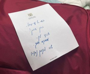 ଇସ୍ରାଏଲର ପ୍ରଧାନମନ୍ତ୍ରୀ ବେଞ୍ଜାମିନ୍ ନେତାନ୍ୟାହୁ ଓ ତାଙ୍କ ପତ୍ନୀ ମୁକ୍ତ ବନ୍ଦୀଙ୍କୁ ସ୍ୱାଗତ କରିବା ପାଇଁ ହାତ ଲେଖା ନୋଟ୍ ଏବଂ ଉପହାର ପ୍ରସ୍ତୁତ କରିଛନ୍ତି। ନୋଟରେ ଲେଖା ଅଛି: “ସମସ୍ତ ଇସ୍ରାଏଲବାସୀଙ୍କ ତରଫରୁ, ସ୍ୱାଗତ! ଆମେ ତୁମକୁ ଅପେକ୍ଷା କରିଥିଲୁ।”