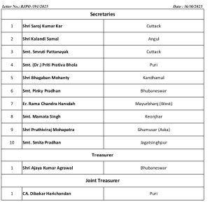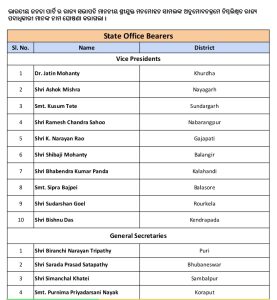 ଭୁବନେଶ୍ଵର, ୧୬/୧୦: ଘୋଷଣା ହେଲା ଓଡ଼ିଶା ବିଜେପିର ନୂଆ ପଦାଧିକାରୀ ତାଲିକା। ୧୦ ଜଣ ସମ୍ପାଦକ, ୧୦ ଜଣ ଉପସଭାପତି, ୪ ଜଣ ସାଧାରଣ ସମ୍ପାଦକ, ଜଣେ କୋଷାଧ୍ୟକ୍ଷ ଓ ଜଣେ ଉପ କୋଷାଧ୍ୟକ୍ଷଙ୍କ ନାଁ ପ୍ରକାଶ କରାଯାଇଛି।