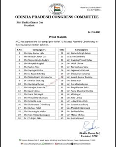 ଭୁବନେଶ୍ଵର, ୧୭/୧୦: ନୂଆପଡ଼ା ଉପନିର୍ବାଚନ ପାଇଁ କଂଗ୍ରେସର ଷ୍ଟାର୍ ପ୍ରଚାରକ ଘୋଷଣା। ୪୦ ଜଣିଆ ଷ୍ଟାର୍ ପ୍ରଚାରକ ତାଲିକା ପ୍ରକାଶ କଲା କଂଗ୍ରେସ। ପ୍ରଚାର କରିବେ ଅଜୟ ଲଲ୍ଲୁ, ଭକ୍ତ ଦାସ, ରାମଚନ୍ଦ୍ର କାଡ଼ାମ୍। ଭୁପେଶ ବଘେଲ, ସଚିନ୍ ପାଇଲଟ୍, ରେବନ୍ତ ରେଡ୍ଡୀ ପ୍ରଚାର କରିବେ। କହ୍ନେୟା କୁମାର, ଅଲକା ଲାମ୍ବା, ନିରଞ୍ଜନ ପଟ୍ଟନାୟକ ପ୍ରଚାର କରିବେ। ନରସିଂହ ମିଶ୍ର, ତାରା ବାହିନୀପତି, ମନୋଜ ମିଶ୍ରଙ୍କୁ ବି ପ୍ରଚାର ଦାୟିତ୍ବ ଦିଆଯାଇଛି।