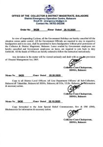 ବାଲେଶ୍ଵର, ୨୫/୧୦: ସମ୍ଭାବ୍ୟ ବାତ୍ୟା ପାଇଁ ବାଲେଶ୍ବରରେ ଛୁଟି ବାତିଲ୍। ସରକାରୀ କର୍ମଚାରୀଙ୍କ ଛୁଟି ବାତିଲ୍ କଲେ ଜିଲ୍ଲାପାଳ। ପରିସ୍ଥିତି ନିଯନ୍ତ୍ରଣାଧୀନ ହେବା ପର୍ଯ୍ୟନ୍ତ ଛୁଟି ବାତିଲ୍। ଛୁଟିରେ ଥିବା କର୍ମଚାରୀଙ୍କୁ ତୁରନ୍ତ ଯୋଗ ଦେବାକୁ ନିର୍ଦ୍ଦେଶ ଦେଇଛନ୍ତି ଜିଲ୍ଲାପାଳ। ଅଧିକାରୀଙ୍କୁ ନିଜ ନିଜ ମୁଖ୍ୟାଳୟରେ ରହିବାକୁ ନିର୍ଦ୍ଦେଶ ଦିଆଯାଇଛି।