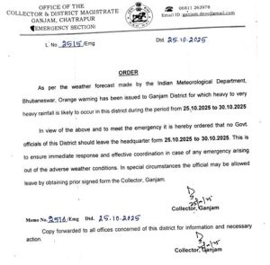 ସମ୍ଭାବ୍ୟ ବାତ୍ୟା ପାଇଁ ଗଞ୍ଜାମରେ ୨୫ରୁ ୩୦ ଛୁଟି ବାତିଲ କରାଯାଇଛି। ମୁଖ୍ୟାଳୟ ଛାଡ଼ି କେହି ନ ଯିବାକୁ ଜିଲ୍ଲାପାଳଙ୍କ ନିର୍ଦ୍ଦେଶ ରହିଛି।