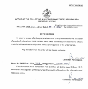 ସମ୍ଭାବ୍ୟ ବାତ୍ୟା ପାଇଁ କେନ୍ଦ୍ରାପଡ଼ା ଜିଲ୍ଲାରେ ମୁଖ୍ୟାଳୟ ଛାଡ଼ିବା ମନା। ସରକାରୀ କର୍ମଚାରୀଙ୍କୁ ମୁଖ୍ୟାଳୟ ନ ଛାଡ଼ିବାକୁ ଜିଲ୍ଲାପାଳଙ୍କ ନିର୍ଦ୍ଦେଶ। ୨୬ରୁ ୩୦ ତାରିଖ ପର୍ଯ୍ୟନ୍ତ କେହି ମୁଖ୍ୟାଳୟ ଛାଡ଼ି ପାରିବେନି କର୍ମଚାରୀ।
