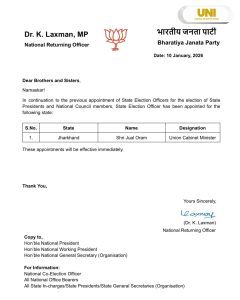 ରାଞ୍ଚି, ୧୦/୦୧: ଝାଡ଼ଖଣ୍ଡ ବିଜେପି ସଭାପତି ନିର୍ବାଚନ ପାଇଁ କେନ୍ଦ୍ର ମନ୍ତ୍ରୀ ଜୁଏଲ ଓରାମଙ୍କୁ ବଡ଼ ଦାୟିତ୍ୱ ଦିଆଯାଇଛି। ଜୁଏଲ ଓରାମଙ୍କୁ ଇଲେକ୍ସନ ଅଫିସର ଭାବେ ଝାଡ଼ଖଣ୍ଡ ରାଜ୍ୟ ବିଜେପି ସଭାପତି ଓ ଜାତୀୟ ପରିଷଦ ସଦସ୍ୟଙ୍କ ନିର୍ବାଚନ ପାଇଁ ଦାୟିତ୍ବ ଦିଆଯାଇଛି। ଏ ନେଇ ବିଜେପି ଜାତୀୟ ରିଟର୍ଣ୍ଣିଂ ଅଫିସରଙ୍କ ପକ୍ଷରୁ ସୂଚନା ଜାରି କରାଯାଇଛି।