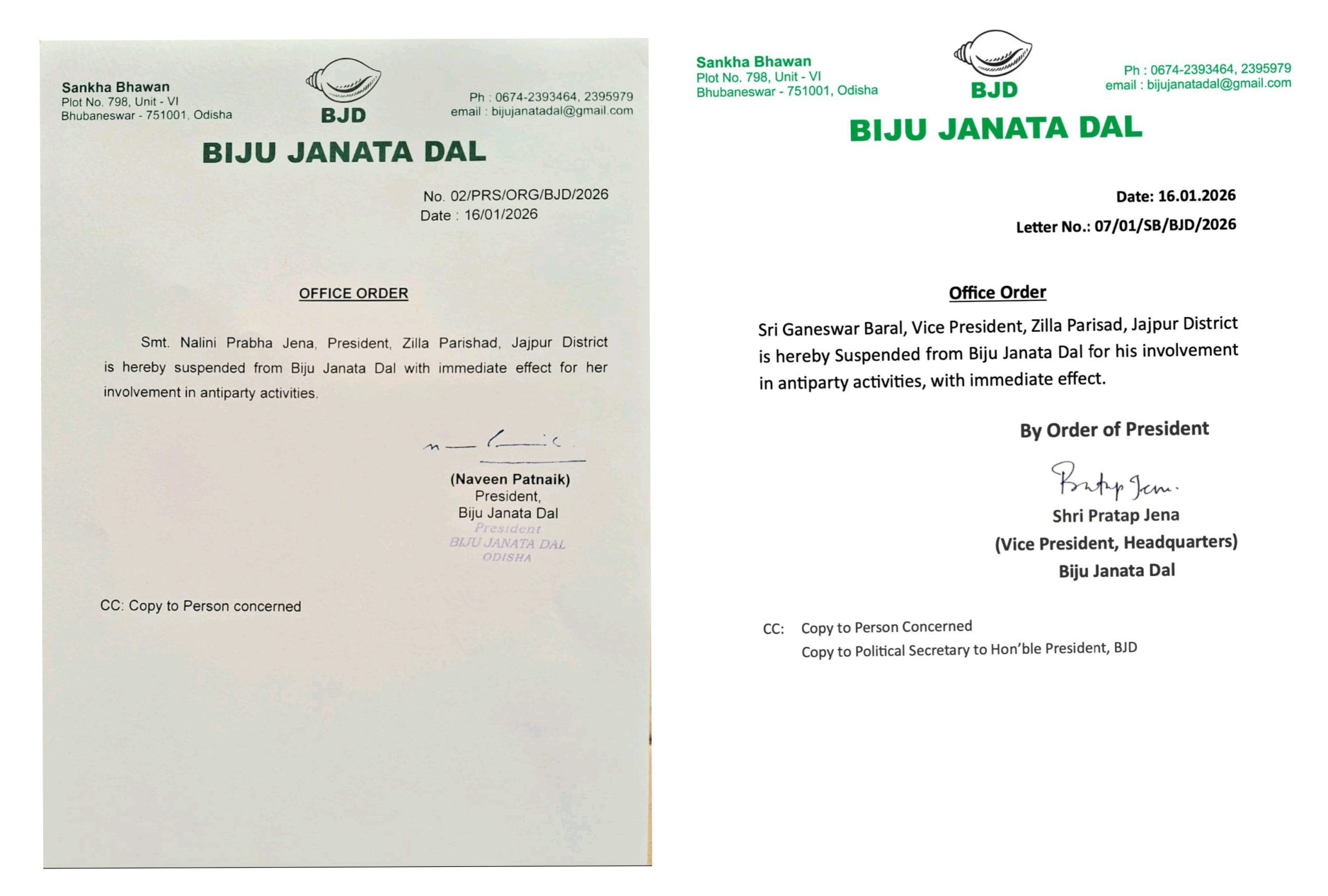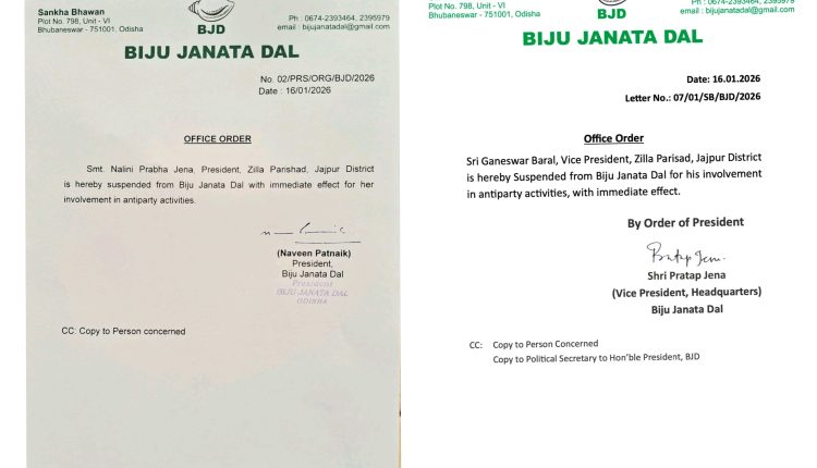 ସେହିପରି ଯାଜପୁର ଜିଲ୍ଲା ପରିଷଦ ଉପାଧ୍ୟକ୍ଷ ଗଣେଶ୍ୱର ବରାଳ ମଧ୍ୟ ନିଲମ୍ୱିତ ହୋଇଛନ୍ତି। ଦଳ ବିରୋଧୀ କାର୍ଯ୍ୟ ପାଇଁ ବିଜେଡି ସଭାପତି ନବୀନ ପଟ୍ଟନାୟକଙ୍କ ନିର୍ଦ୍ଦେଶରେ ନିଲମ୍ବନ କରାଯାଇଛି।