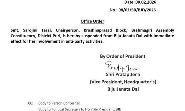 ପୁରୀ, ୦୮/୦୨: ଦଳ ବିରୋଧୀ କାର୍ଯ୍ୟକଳାପ ପାଇଁ ପୁରୀ ଜିଲ୍ଲାର ବ୍ରହ୍ମଗିରି ବିଧାନସଭା ନିର୍ବାଚନମଣ୍ଡଳୀ ଅନ୍ତର୍ଗତ କୃଷ୍ଣପ୍ରସାଦ ବ୍ଲକର ଅଧ୍ୟକ୍ଷା ସରୋଜିନୀ ତରାଇଙ୍କୁ ବିଜୁ ଜନତା ଦଳ ତୁରନ୍ତ ନିଲମ୍ବନ କରିଛି।