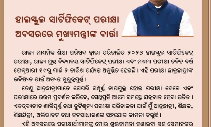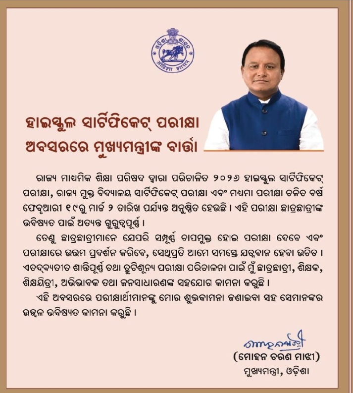 ଛାତ୍ରଛାତ୍ରୀଙ୍କୁ ପରୀକ୍ଷା ପାଇଁ ଶୁଭାକାମନା ଜଣାଇଛନ୍ତି ମୁଖ୍ୟମନ୍ତ୍ରୀ ମୋହନ ମାଝୀ। ଚାପମୁକ୍ତ ହୋଇ ପରୀକ୍ଷା ଦେବାକୁ ମୁଖ୍ୟମନ୍ତ୍ରୀ ପରାମର୍ଶ ଦେଇଛନ୍ତି। ତ୍ରୁଟିଶୂନ୍ୟ ପରୀକ୍ଷା ପାଇଁ ସମସ୍ତଙ୍କ ସହଯୋଗ ଲୋଡ଼ିଛନ୍ତି।