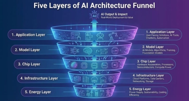 ଏଆଇ ଷ୍ଟାକ୍ ପାଞ୍ଚଟି ସ୍ତରରେ ଗଠିତ ହୋଇଥାଏ। ପ୍ରତିଟି ସ୍ତର ଏକ ଗୁରୁତ୍ୱପୂର୍ଣ୍ଣ ଭୂମିକା ଗ୍ରହଣ କରେ। ଲୋକମାନେ ପ୍ରତିଦିନ ବ୍ୟବହାର କରୁଥିବା ଆପ୍ ଠାରୁ ଆରମ୍ଭ କରି ଏସବୁର ପଛରେ କାର୍ଯ୍ୟ କରୁଥିବା ତଥ୍ୟ, କମ୍ପ୍ୟୁଟିଂ ଶକ୍ତି, ନେଟୱାର୍କ ଏବଂ ଶକ୍ତି ପର୍ଯ୍ୟନ୍ତ, ଏଆଇ ଷ୍ଟାକ୍ କୃତ୍ରିମ ବୁଦ୍ଧିମତ୍ତାକୁ ବାସ୍ତବ ଦୁନିଆରେ କାର୍ଯ୍ୟକାରୀ କରାଏ। ଏକତ୍ରିତ ଭାବରେ, ଏହି ସ୍ତରଗୁଡ଼ିକ ନିଶ୍ଚିତ କରନ୍ତି ଯେ ଏଆଇ ସମାଧାନଗୁଡିକ ବ୍ୟାପକ, ନିର୍ଭରଯୋଗ୍ୟ ଭାବେ ବିଭିନ୍ନ ବର୍ଗର ଜନମାନସରେ ପ୍ରଭାବ ପକାଇବାକୁ ସକ୍ଷମ। ଆସନ୍ତୁ ନଜର ପକାଇବା ଏହି ୫ଟି ସ୍ତର ଓ ଏହାର ଉପଯୋଗୀତା ବାବଦରେ।