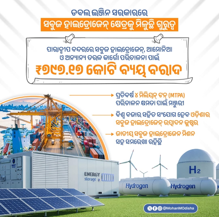ଏହି ପରିପ୍ରେକ୍ଷୀରେ ପ୍ରଧାନମନ୍ତ୍ରୀ ନରେନ୍ଦ୍ର ମୋଦି ଓ କେନ୍ଦ୍ର ବନ୍ଦର ମନ୍ତ୍ରୀ ସର୍ବାନନ୍ଦ ସୋନୱାଲଙ୍କୁ ଧନ୍ୟବାଦ ଜଣାଇଛନ୍ତି ମୁଖ୍ୟମନ୍ତ୍ରୀ ମୋହନ ଚରଣ ମାଝୀ। “ଡବଲ ଇଞ୍ଜିନ ସରକାରର ଦୃଢ଼ ପ୍ରୟାସରେ ଓଡ଼ିଶା ଅକ୍ଷୟ ଶକ୍ତି କ୍ଷେତ୍ରରେ ଆଗକୁ ବଢୁଛି। ପାରାଦ୍ୱୀପ ବନ୍ଦରରେ ସବୁଜ ହାଇଡ୍ରୋଜେନ୍, ଆମୋନିଆ ଓ ଅନ୍ୟାନ୍ୟ ତରଳ କାର୍ଗୋ ପରିଚାଳନା ପାଇଁ ₹୭୯୭.୧୭ କୋଟି ବ୍ୟୟ ବରାଦ ସହ ପ୍ରତିବର୍ଷ ୪ ମିଲିୟନ୍ ଟନ୍ କ୍ଷମତାର ପ୍ରକଳ୍ପକୁ ମଞ୍ଜୁରୀ ମିଳିଛି। ଏହା ମାଧ୍ୟମରେ ଓଡ଼ିଶାର ସବୁଜ ହାଇଡ୍ରୋଜେନ୍ ଉତ୍ପାଦନ କ୍ଲଷ୍ଟର ବିଶ୍ୱ ବଜାର ସହିତ ସଂଯୁକ୍ତ ହେବା ସହ ଜାତୀୟ ସବୁଜ ହାଇଡ୍ରୋଜେନ ମିଶନ ସହ ସମାନ୍ତରାଳ ଭାବରେ ଶିଳ୍ପ ଉନ୍ନୟନକୁ ନୂତନ ଗତି ଦେବ।” ବୋଲି ମୁଖ୍ୟମନ୍ତ୍ରୀ କହିଛନ୍ତି।