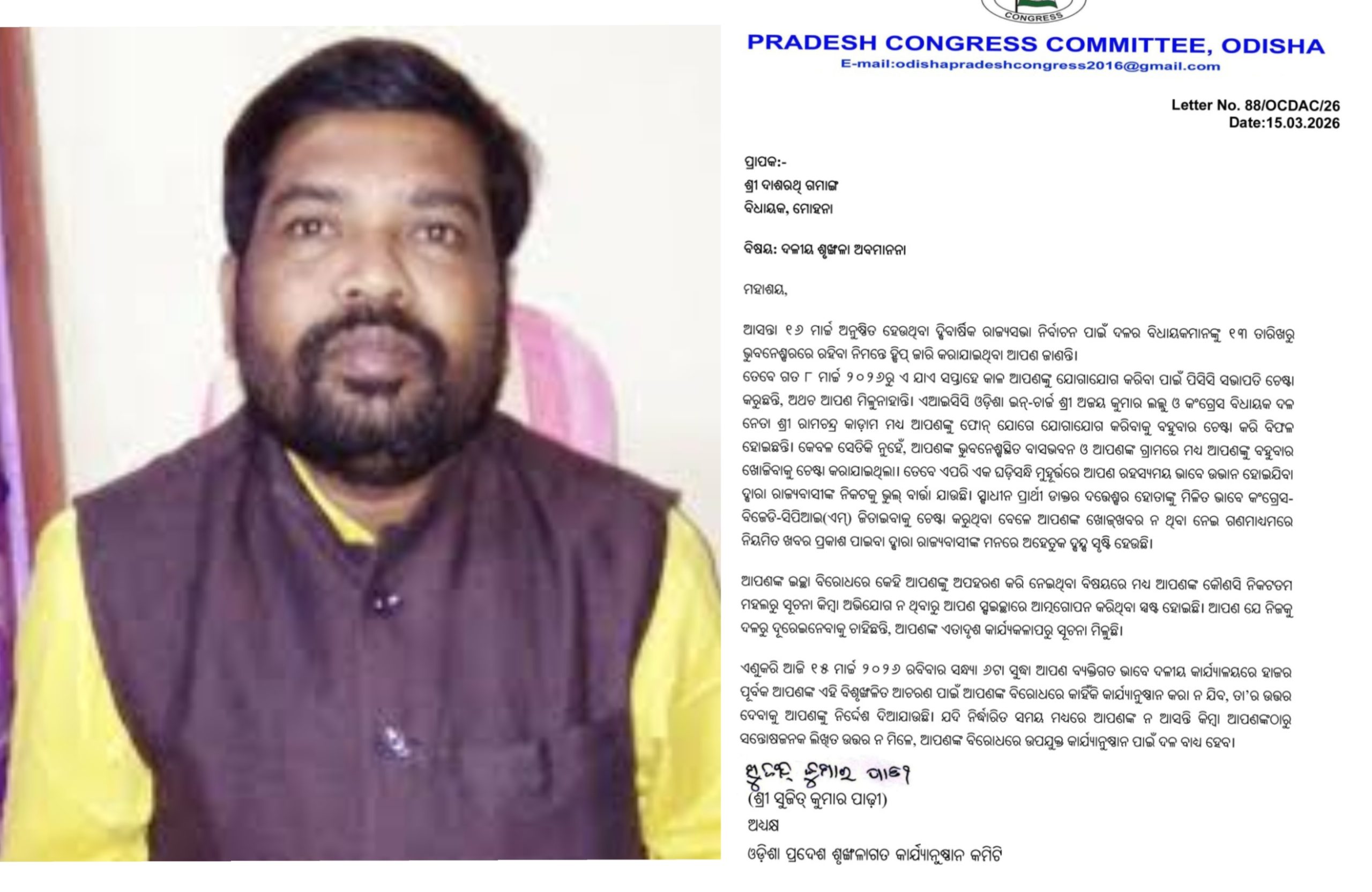 ଭୁବନେଶ୍ୱର, ୧୫/୦୩: କଂଗ୍ରେସର ମେହନା ବିଧାୟକ ଦାଶରଥୀ ଗମାଙ୍ଗଙ୍କୁ ସୋ କଜ୍ ନୋଟିସ୍। କାରଣ ଦର୍ଶାଅ ନୋଟିସ୍ ଜାରି କଲା PCC ଶୃଙ୍ଖଳା କମିଟି। ଆଜି ସନ୍ଧ୍ୟା ୬ଟା ସୁଦ୍ଧା ଦଳୀୟ କାର୍ଯ୍ୟାଳୟରେ ହାଜର ହେବାକୁ ନିର୍ଦ୍ଦେଶ ରହିଛି। ବ୍ୟକ୍ତିଗତ ଭାବେ ହାଜର ହୋଇ ଉତ୍ତର ଦେବାକୁ ନିର୍ଦ୍ଦେଶ ଦିଆଯାଇଛି। ନିର୍ଦ୍ଧାରିତ ସମୟରେ ନ ପହଞ୍ଚିଲେ କିମ୍ବା ସନ୍ତୋଷଜନକ ଲିଖିତ ଉତ୍ତର ନ ଦେଲେ କାର୍ଯ୍ୟାନୁଷ୍ଠାନ ଗ୍ରହଣ କରାଯିବ ବୋଲି ଚେତାବନୀ ଦିଆଯାଇଛି।