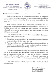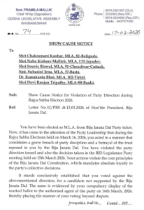 ରାଜ୍ୟସଭା ନିର୍ବାଚନରେ ଦଳୀୟ ହ୍ବିପ୍ କାମ କରେ ନାହିଁ ବୋଲି ଚିଠିରେ ଦର୍ଶାଇଲେ ବିଧାୟକ। ମୁଖ୍ୟ ସଚେତକ ହ୍ବିପ୍ ଜାରି କରି ବେଆଇନ କାର୍ଯ୍ୟ କରିଛନ୍ତି। ଭୋଟ୍ ଦେବା ପାଇଁ କହିବା ଓ ବିରତ ପାଇଁ ପ୍ରବର୍ତ୍ତାଇବା ଦଣ୍ଡନୀୟ ଅପରାଧ। ଏଥିପାଇଁ BNS- ୧୭୧ ଅନୁଯାୟୀ ବର୍ଷେ ଜେଲ୍ ଦଣ୍ଡର ପ୍ରାବଧାନ ରହିଛି। କାରଣ ଦର୍ଶାଅ ନୋଟିସ୍ ପ୍ରତ୍ୟାହାର କରନ୍ତୁ, ନଚେତ୍ ଫୌଜଦାରୀ ମାମଲାକୁ ସାମ୍ନା କରନ୍ତୁ ବୋଲି ବିଧାୟକମାନେ କହିଛନ୍ତି।