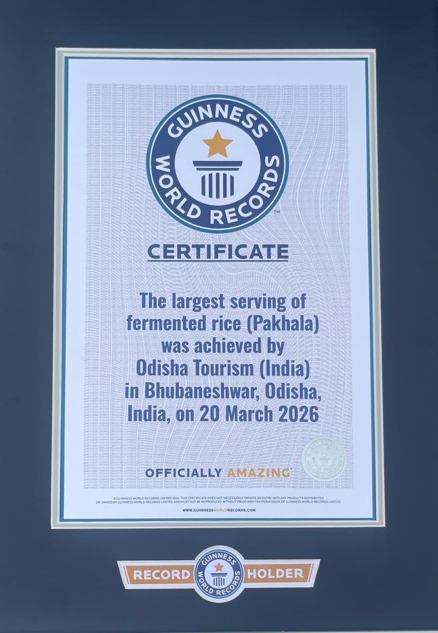ଭୁବନେଶ୍ଵର, ୨୦/୦୩/୨୦୨୬: ଓଡ଼ିଶାର ପର୍ଯ୍ୟଟନ ବିଭାଗ ଏକ ଐତିହାସିକ ବିଶ୍ୱସ୍ତରୀୟ ସଫଳତା ହାସଲ କରିଛି। ଏକାସାଙ୍ଗରେ ୧,୧୭୪ କିଲୋଗ୍ରାମ ଓଜନର ପଖାଳ ପ୍ରସ୍ତୁତ କରି ଏବଂ ଏକ ବିଶାଳ ପାତ୍ରରେ ପରିବେଷଣ କରି ‘ବୃହତ୍ତମ ଫର୍ମେଣ୍ଟେଡ୍ ରାଇସ୍ (ପଖାଳ) ପରିବେଷଣ’ ପାଇଁ ଗିନିଜ୍ ୱାର୍ଲ୍ଡ ରେକର୍ଡରେ ସ୍ଥାନ ପାଇଛି।