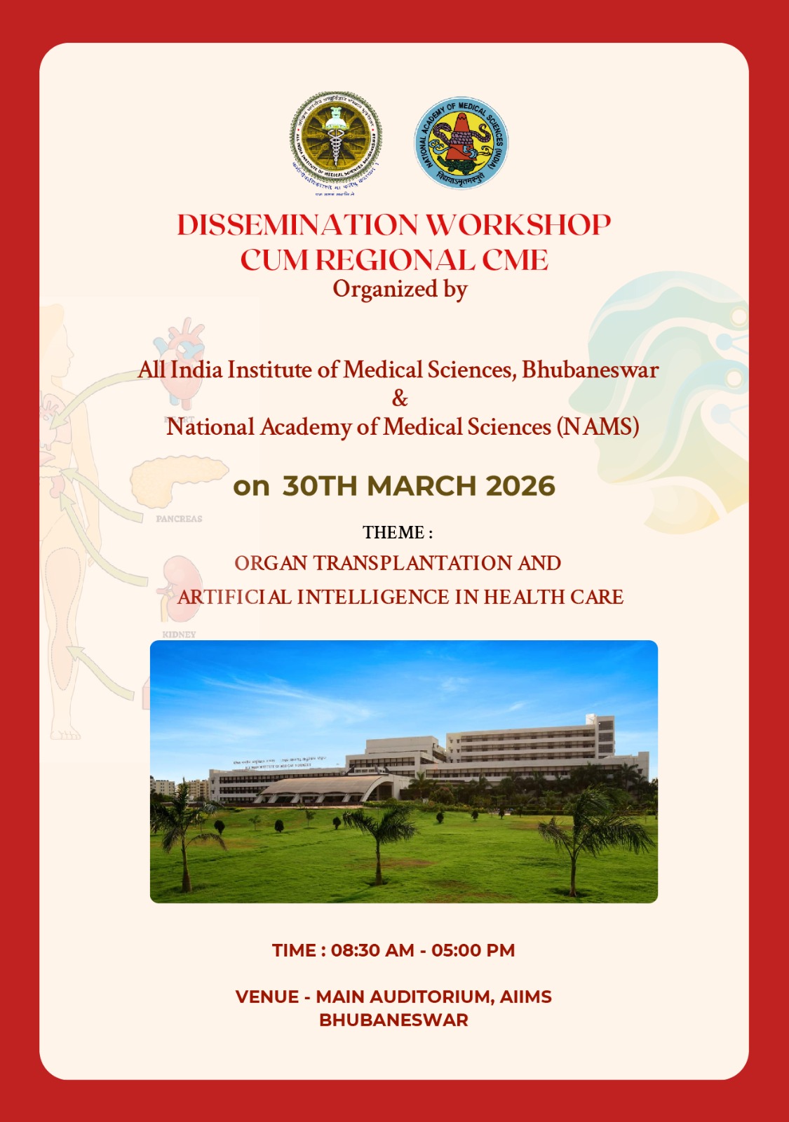 ଅଙ୍ଗ ପ୍ରତିରୋପଣ ଏବଂ ସ୍ୱାସ୍ଥ୍ୟସେବାରେ କୃତ୍ରିମ ବୁଦ୍ଧିମତ୍ତାର ଉପଯୋଗ, ଏମ୍ସ ଭୁବନେଶ୍ବର ଓ ନାମ୍ସ ପକ୍ଷରୁ ଆଞ୍ଚଳିକ ଚିକିତ୍ସା ଶିକ୍ଷା କାର୍ଯ୍ୟକ୍ରମ