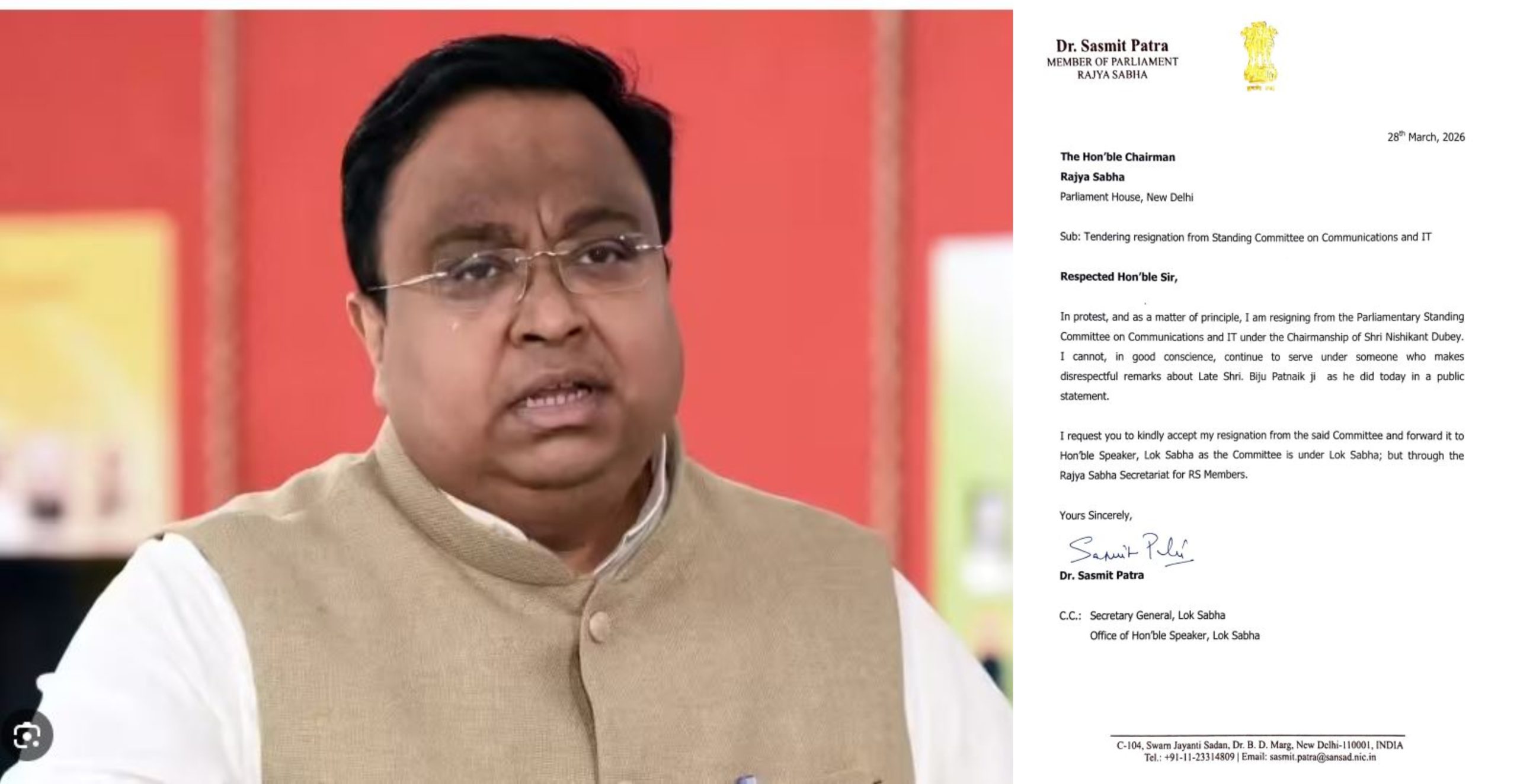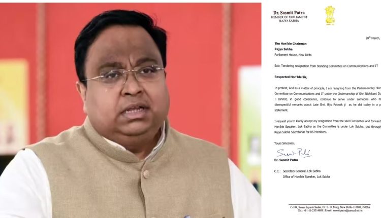 ଭୁବନେଶ୍ୱର, ୨୯/୦୩: ଓଡ଼ିଶାର ପୂର୍ବତନ ମୁଖ୍ୟମନ୍ତ୍ରୀ ବିଜୁ ପଟ୍ଟନାୟକଙ୍କ ବିରୋଧରେ ଅପମାନଜନକ ମନ୍ତବ୍ୟ ପାଇଁ ପଦ ଛାଡ଼ିଲେ ସାଂସଦ ସସ୍ମିତ ପାତ୍ର। ବିଜେପି ସାଂସଦ ନିଶିକାନ୍ତ ଦୁବେଙ୍କ ମନ୍ତବ୍ୟ ପ୍ରତିବାଦରେ ଯୋଗାଯୋଗ ଏବଂ ସୂଚନା ପ୍ରଯୁକ୍ତି କମିଟି ସଦସ୍ୟ ପଦରୁ ଦେଲେ ଇସ୍ତଫା। କମିଟିର ଅଧ୍ୟକ୍ଷ ପଦରେ ନିଶିକାନ୍ତ ଥିବାରୁ ତାଙ୍କୁ ପ୍ରତିବାଦ କରି ଇସ୍ତଫା ଦେଇଛନ୍ତି ସସ୍ମିତ।