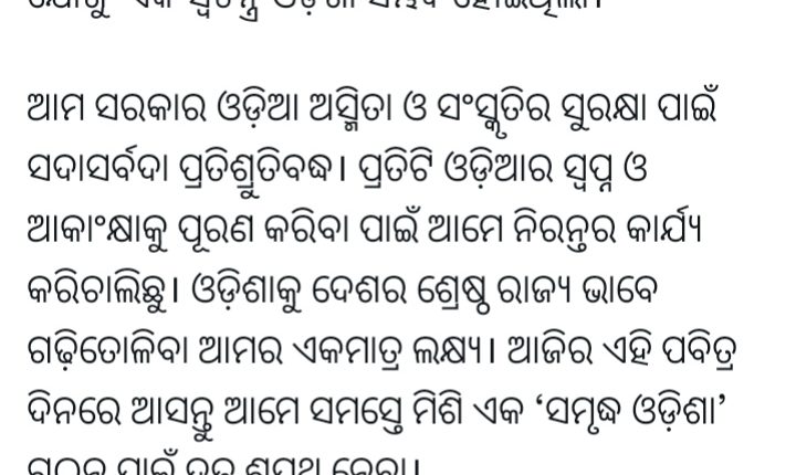 ଆମ ସରକାର ଓଡ଼ିଆ ଅସ୍ମିତା ଓ ସଂସ୍କୃତିର ସୁରକ୍ଷା ପାଇଁ ସଦାସର୍ବଦା ପ୍ରତିଶ୍ରୁତିବଦ୍ଧ। ପ୍ରତିଟି ଓଡ଼ିଆର ସ୍ୱପ୍ନ ଓ ଆକାଂକ୍ଷାକୁ ପୂରଣ କରିବା ପାଇଁ ଆମେ ନିରନ୍ତର କାର୍ଯ୍ୟ କରିଚାଲିଛୁ। ଓଡ଼ିଶାକୁ ଦେଶର ଶ୍ରେଷ୍ଠ ରାଜ୍ୟ ଭାବେ ଗଢ଼ିତୋଳିବା ଆମର ଏକମାତ୍ର ଲକ୍ଷ୍ୟ। ଆଜିର ଏହି ପବିତ୍ର ଦିନରେ ଆସନ୍ତୁ ଆମେ ସମସ୍ତେ ମିଶି ଏକ ‘ସମୃଦ୍ଧ ଓଡ଼ିଶା’ ଗଠନ ପାଇଁ ଦୃଢ଼ ଶପଥ ନେବା।