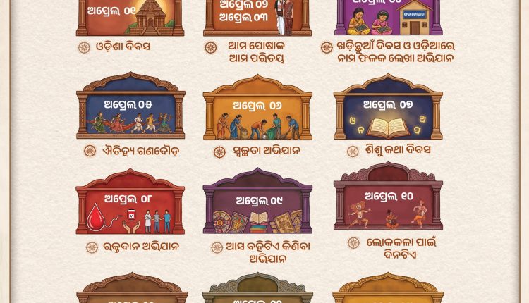 ଏପ୍ରିଲ ୪ ତାରିଖ ଦିନ ବିଦ୍ୟାଳୟ ଓ ଗଣଶିକ୍ଷା ବିଭାଗ ପକ୍ଷରୁ ଖଡ଼ିଛୁଆଁ ଓ ପ୍ରବେଶ ଉତ୍ସବ ଏବଂ ଶ୍ରମ ଓ କର୍ମଚାରୀ ରାଜ୍ୟ ବୀମା ବିଭାଗ ପକ୍ଷରୁ ଓଡ଼ିଆରେ ନାମ ଫଳକ ଲେଖା ଅଭିଯାନର ଆୟୋଜନ କରାଯିବ।