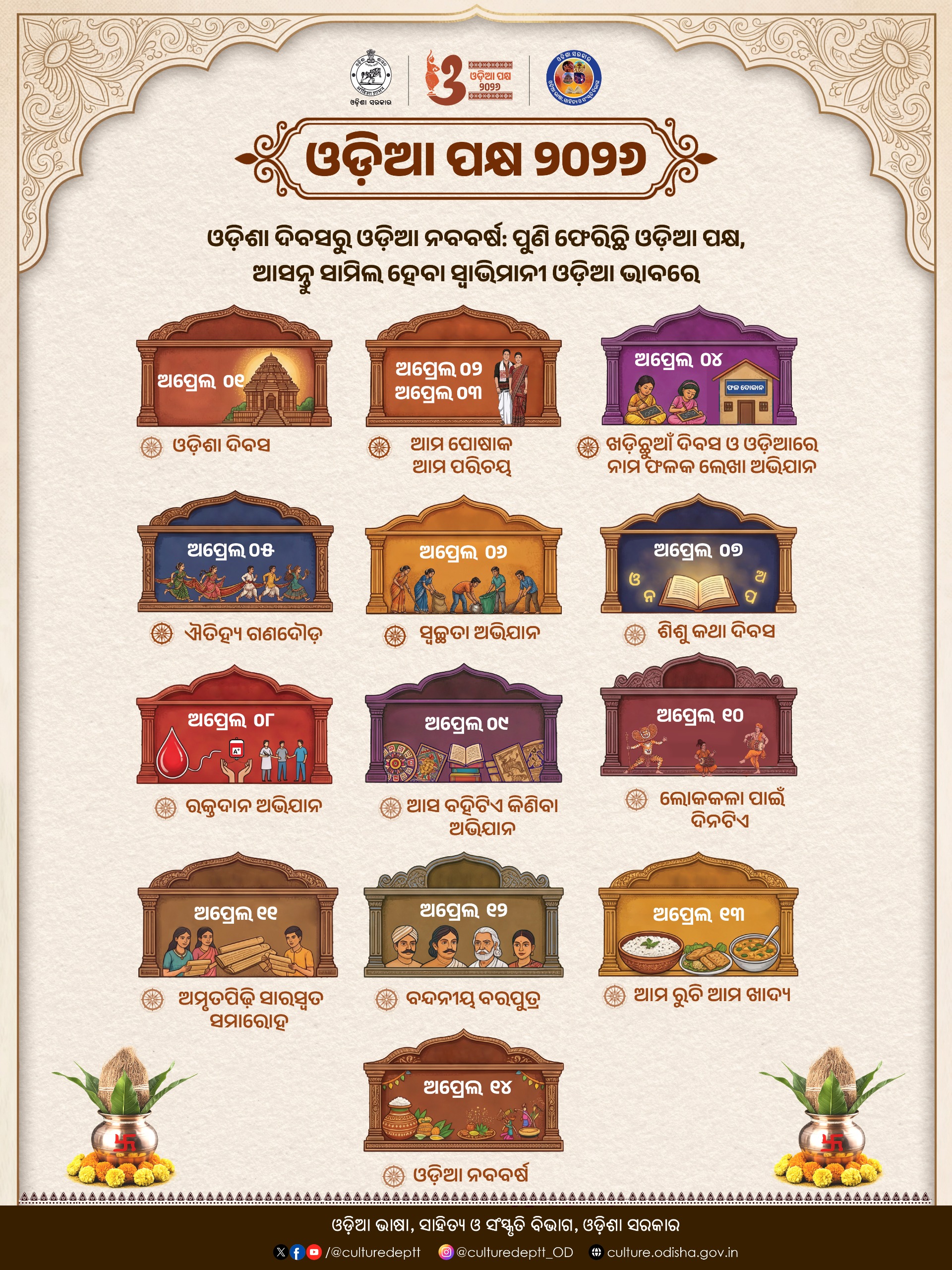 ସୂଚନାଯୋଗ୍ୟ ଯେ, ଓଡ଼ିଆ ସଂସ୍କୃତିକୁ ବିଶ୍ୱବିଦିତ କରିବା ଲକ୍ଷ୍ୟ ନେଇ ଆମ ଯୁବପିଢ଼ିଙ୍କୁ ଓଡ଼ିଆ ସଂସ୍କୃତି ସହ ପୁନଃ ସଂଯୋଜିତ କରିବା ପାଇଁ ଓଡ଼ିଶାର ସମସ୍ତ ବ୍ଲକରୁ ରାଜଧାନୀ ଭୁବନେଶ୍ୱର ପର୍ଯ୍ୟନ୍ତ ଓଡ଼ିଆ ପକ୍ଷ ପାଳନ କରାଯାଉଛି। ଓଡ଼ିଆ ପକ୍ଷ ପାଳନର ପ୍ରତ୍ୟେକ ଦିନ ସରକାରଙ୍କ ବିଭିନ୍ନ ବିଭାଗ ପକ୍ଷରୁ ବିଭିନ୍ନ କାର୍ଯ୍ୟକ୍ରମର ଆୟୋଜନ କରାଯାଉଛି।