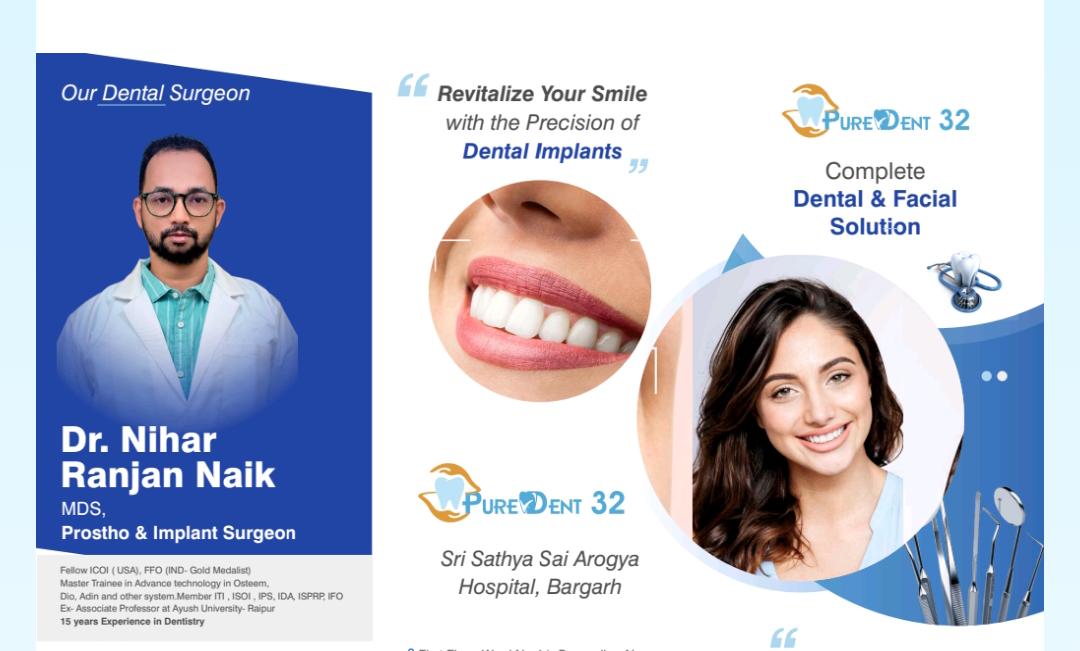 ବରଗଡ଼, ୦୫/୦୪: ଆଜିକାଲିର ବ୍ୟସ୍ତବହୁଳ ଜୀବନଶୈଳୀ ମଧ୍ୟରେ ଦନ୍ତ ସମସ୍ୟା ଏକ ସାଧାରଣ କଥା ହୋଇଗଲାଣି। କିନ୍ତୁ ଏବେ ବରଗଡ଼ ସହରରେ ଦନ୍ତ ଚିକିତ୍ସା କ୍ଷେତ୍ରରେ ଏକ ନୂତନ ଅଧ୍ୟାୟ ଆରମ୍ଭ କରିଛି ‘ପିଓର୍ ଡେଣ୍ଟ ୩୨’ (Pure Dent 32)। ଶ୍ରୀ ସତ୍ୟ ସାଇ ଆରୋଗ୍ୟ ହସ୍ପିଟାଲ ପରିସରରେ ଥିବା ଏହି କ୍ଲିନିକରେ ଅଭିଜ୍ଞ ଦନ୍ତ ରୋଗ ବିଶେଷଜ୍ଞ ଡାକ୍ତର ନିହାର ରଞ୍ଜନ ନାୟକ (MDS, Prostho & Implant Surgeon) ରୋଗୀଙ୍କୁ ସେବା ଯୋଗାଇ ଦେଉଛନ୍ତି।