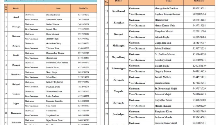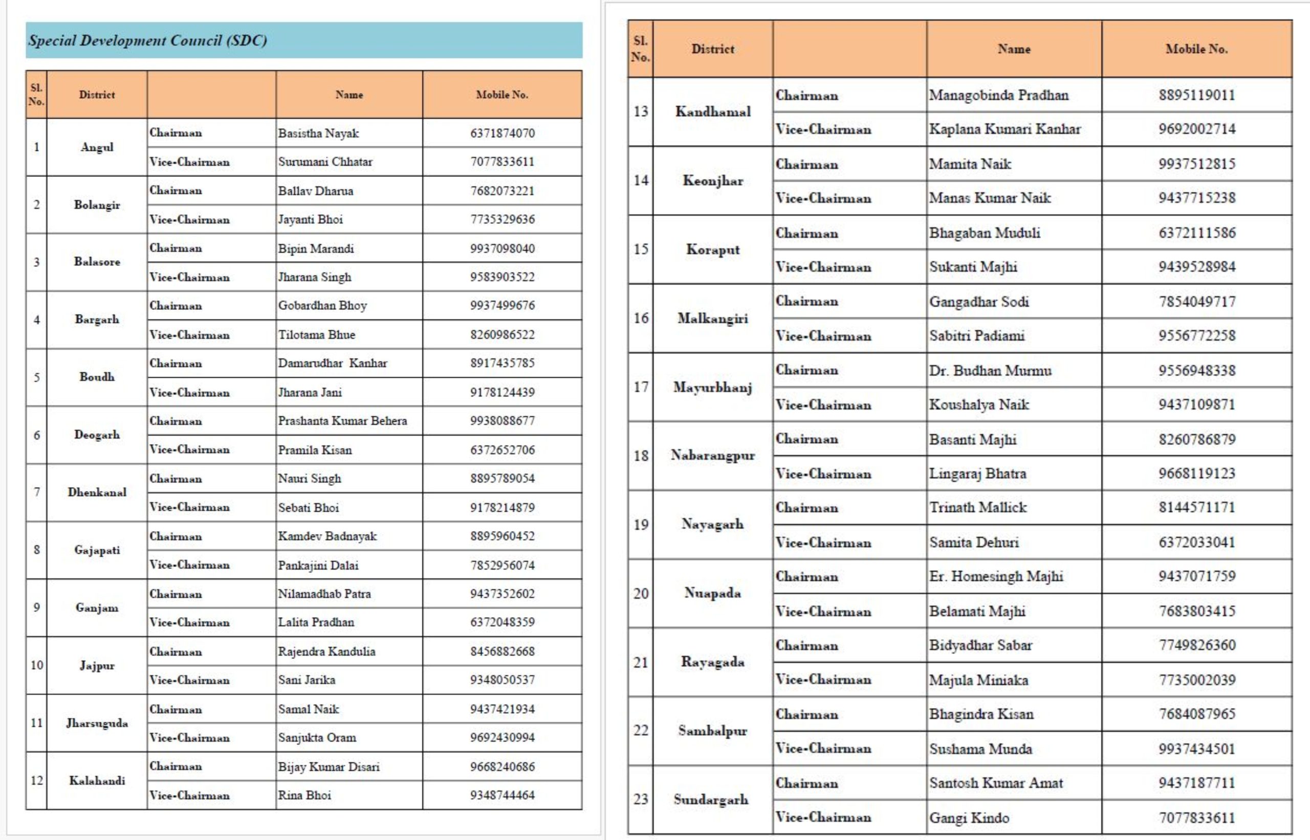 ଭୁବନେଶ୍ୱର, ୦୬/୦୩: ୨୩ ଜିଲ୍ଲା ପାଇଁ ଘୋଷଣା ହେଲା ସ୍ବତନ୍ତ୍ର ଉନ୍ନୟନ ପରିଷଦ। ଅନୁଗୁଳ-ବଶିଷ୍ଠ ନାୟକ (ଅଧ୍ୟକ୍ଷ), ସୁରୁମୁଣି ଛତର (ଉପାଧ୍ୟକ୍ଷ); ବଲାଙ୍ଗିର- ବଲ୍ଲଭ ଧରୁଆ (ଅଧ୍ୟକ୍ଷ), ଜୟନ୍ତୀ ଭୋଇ (ଉପାଧ୍ୟକ୍ଷ); ବାଲେଶ୍ୱର- ବିପିନ୍ ମାରାଣ୍ଡି (ଅଧ୍ୟକ୍ଷ), ଝରଣା ସିଂ (ଉପାଧ୍ୟକ୍ଷ); ବରଗଡ଼- ଗୋବର୍ଦ୍ଧନ ଭୋଏ (ଅଧ୍ୟକ୍ଷ), ତିଳତ୍ତୋମା ଭୁଏ (ଉପାଧ୍ୟକ୍ଷ); ବୌଦ୍ଧ- ଡମରୁ ଧର କହଁର (ଅଧ୍ୟକ୍ଷ), ଝରଣା ଜାନି (ଉପାଧ୍ୟକ୍ଷ); ଦେବଗଡ଼- ପ୍ରଶାନ୍ତ ବେହେରା (ଅଧ୍ୟକ୍ଷ), ପ୍ରମିଳା କିଶାନ (ଉପାଧ୍ୟକ୍ଷ); ଢେଙ୍କାନାଳ- ନାଉରି ସିଂ (ଅଧ୍ୟକ୍ଷ), ସେବତୀ ଭୋଇ (ଉପାଧ୍ୟକ୍ଷ); ଗଜପତି- କାମଦେବ ବଡ଼ନାୟକ (ଅଧ୍ୟକ୍ଷ), ପଙ୍କଜିନୀ ଦଳାଇ (ଉପାଧ୍ୟକ୍ଷ); ଗଞ୍ଜାମ- ନୀଳମାଧବ ପାତ୍ର (ଅଧ୍ୟକ୍ଷ), ଲଳିତା ପ୍ରଧାନ (ଉପାଧ୍ୟକ୍ଷ); ଯାଜପୁର- ରାଜେନ୍ଦ୍ର କାନ୍ଦୁଲିଆ (ଅଧ୍ୟକ୍ଷ), ଶାନି ଜରିକା (ଉପାଧ୍ୟକ୍ଷ); ଝାରସୁଗୁଡ଼ା- ସାମଲ ନାଏକ (ଅଧ୍ୟକ୍ଷ), ସଂଯୁକ୍ତା ଓରାମ (ଉପାଧ୍ୟକ୍ଷ); କଳାହାଣ୍ଡି- ବିଜୟ ଦିଶାରୀ (ଅଧ୍ୟକ୍ଷ), ରୀନା ଭୋଇ (ଉପାଧ୍ୟକ୍ଷ); କନ୍ଧମାଳ- ମାନଗୋବିନ୍ଦ ପ୍ରଧାନ (ଅଧ୍ୟକ୍ଷ), କଳ୍ପନା କହଁର (ଉପାଧ୍ୟକ୍ଷ)।
