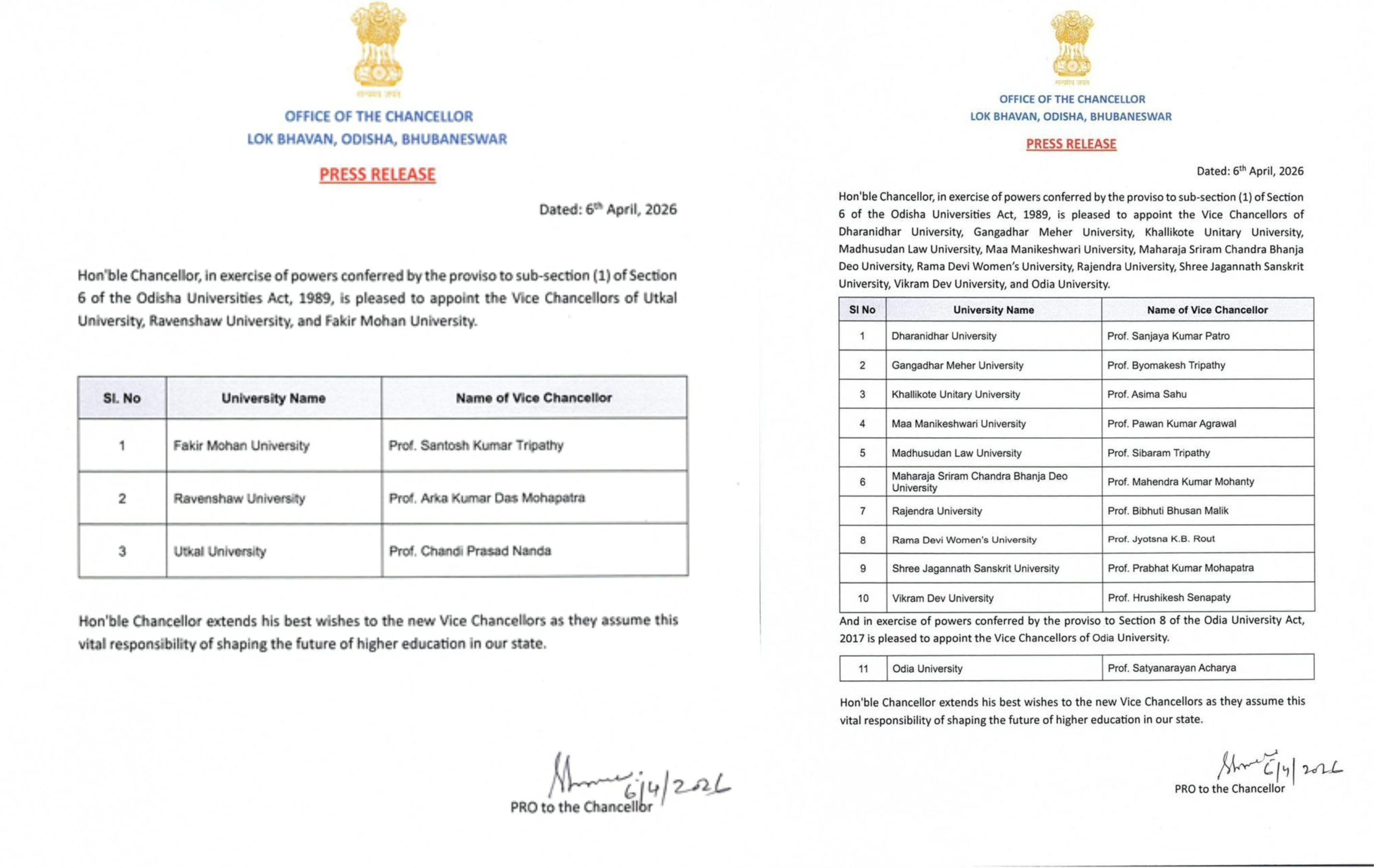 ରାଜ୍ୟର ୧୪ଟି ବିଶ୍ବବିଦ୍ୟାଳୟ ପାଇଁ କୁଳପତି ନିଯୁକ୍ତ