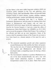 ଏହା ପୂର୍ବରୁ ୨୦୨୨ ମସିହାରେ ଅପରାଜିତା ଷଡ଼ଙ୍ଗୀ ତତ୍କାଳୀନ ମୁଖ୍ୟମନ୍ତ୍ରୀ ନବୀନ ପଟ୍ଟନାୟକଙ୍କୁ ମଧ୍ୟ ଏକ ଚିଠି ଲେଖି ଭୁବନେଶ୍ୱର-କଟକ ମଧ୍ୟରେ ଏକୀକୃତ ମେଟ୍ରୋ ରେଳ ବ୍ୟବସ୍ଥା ପାଇଁ କେନ୍ଦ୍ର ସରକାରଙ୍କୁ ପ୍ରସ୍ତାବ ପଠାଇବାକୁ ଅନୁରୋଧ କରିଥିଲେ। ସେତେବେଳେ ସେ କହିଥିଲେ ଯେ ଦୁଇ ସହରର ଜନସଂଖ୍ୟା ୨୦ ଲକ୍ଷରୁ ଅଧିକ ହେବା ଯୋଗୁଁ ମେଟ୍ରୋ ଦରକାର। ସାମ୍ପ୍ରତିକ ଚିଠିରେ ସେ ବିଜେପି ସରକାରଙ୍କୁ ପ୍ରକଳ୍ପକୁ ପୁନର୍ବିଚାର କରି ସ୍ଥାୟୀ ଭାବେ ଆଗକୁ ବଢ଼ାଇବା ପାଇଁ କହିଛନ୍ତି।