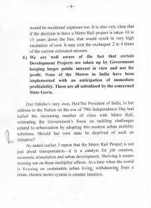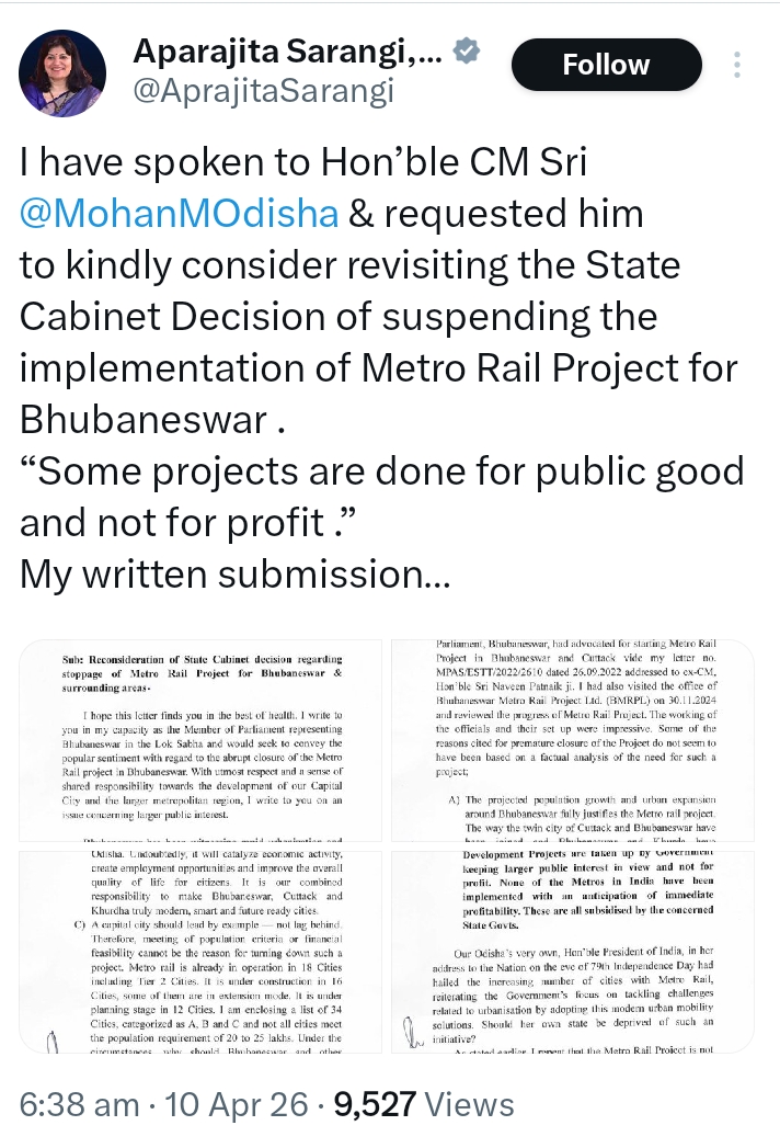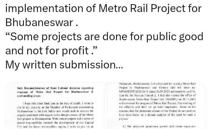 ସାଂସଦ ଷଡ଼ଙ୍ଗୀ ଭୁବନେଶ୍ୱର ଏବଂ ଆଖପାଖ ଅଞ୍ଚଳରେ ଆଧୁନିକ ସହରୀ ପରିବହନ ବ୍ୟବସ୍ଥାର ଆବଶ୍ୟକତା ଉପରେ ଗୁରୁତ୍ୱ ଦେଇଛନ୍ତି। ମେଟ୍ରୋ ପ୍ରକଳ୍ପ ବନ୍ଦ କରିବା ନିଷ୍ପତ୍ତି ପ୍ରତି ଗଭୀର ଚିନ୍ତା ପ୍ରକାଶ କରିଛନ୍ତି। ସହରର ବଢ଼ୁଥିବା ଜନସଂଖ୍ୟା, ଯାତାୟାତ ସମସ୍ୟା ଏବଂ ଭବିଷ୍ୟତର ଉନ୍ନତି ପାଇଁ ମେଟ୍ରୋ ଜରୁରୀ ବୋଲି କହିଛନ୍ତି। ପୂର୍ବରୁ ପ୍ରକଳ୍ପ ଆରମ୍ଭ ହୋଇଥିଲା। ତେଣୁ ଏହାକୁ ପୁନର୍ବିଚାର କରି ଆଗକୁ ବଢ଼ାଇବା ପାଇଁ ଅନୁରୋଧ କରିଛନ୍ତି।