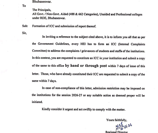 ଭୁବନେଶ୍ୱର, ୧୧/୦୪: ସପ୍ତାହେ ଭିତରେ ସବୁ କଲେଜରେ ଆଭ୍ୟନ୍ତରୀଣ ଅଭିଯୋଗ କମିଟି- ICC ଗଠନ ପାଇଁ ନିର୍ଦ୍ଦେଶ। ଏନେଇ ସବୁ ସରକାରୀ, ବେସରକାରୀ, ଅନୁଦାନପ୍ରାପ୍ତ କଲେଜ ଅଧ୍ୟକ୍ଷଙ୍କୁ ଚିଠି ଲେଖିଛନ୍ତି ଆଞ୍ଚଳିକ ନିର୍ଦ୍ଦେଶାଳୟ ଶିକ୍ଷା ନିର୍ଦ୍ଦେଶକ। କମିଟି ଗଠନ ନ କଲେ ୨୦୨୬-୨୭ ବର୍ଷ ପାଇଁ ଆଡମିଶନ କଟକଣା ଲାଗିବ ବୋଲି ନିର୍ଦ୍ଦେଶନାମାରେ ରହିଛି।
